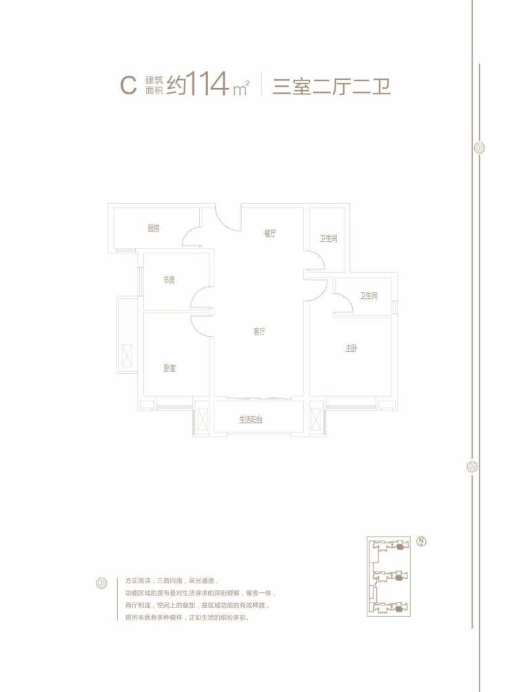 户型4(C)单套建筑面积约114㎡,三室二厅二卫;