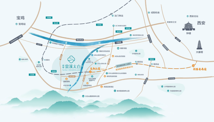 约70km接驳宝鸡,约110km抵达西安,约120km畅达咸阳机场,紧邻关中公共交通枢纽(轻轨站与客运站),近距离已开建西法城际铁路太白山站(规划),轨道建成后将融入西安半小时经济圈。