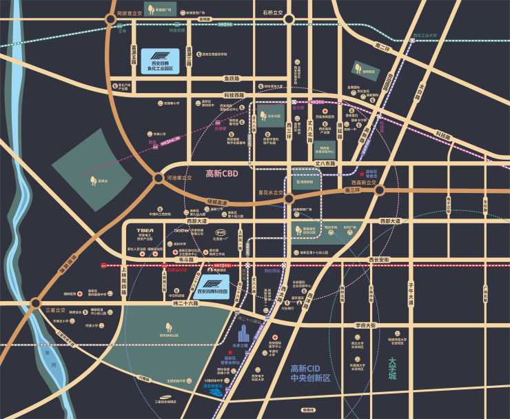 产业:中交科技城、三星环动力电池、中航电测、陕西光电科学院、中国科学院西安光学 研究院、中国通讯建设、未来之瞳超高层建筑群...