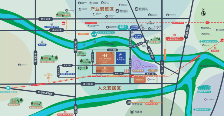 1.医疗教育:西安交大附属医院泾河医院、西安红会医院泾河医院、西安市儿童医院泾河医院、泾河新城第一人民医院;小区两所幼儿园、黄冈中学(小学至高中均已开学)、陕师大附小附中(已开学)。
