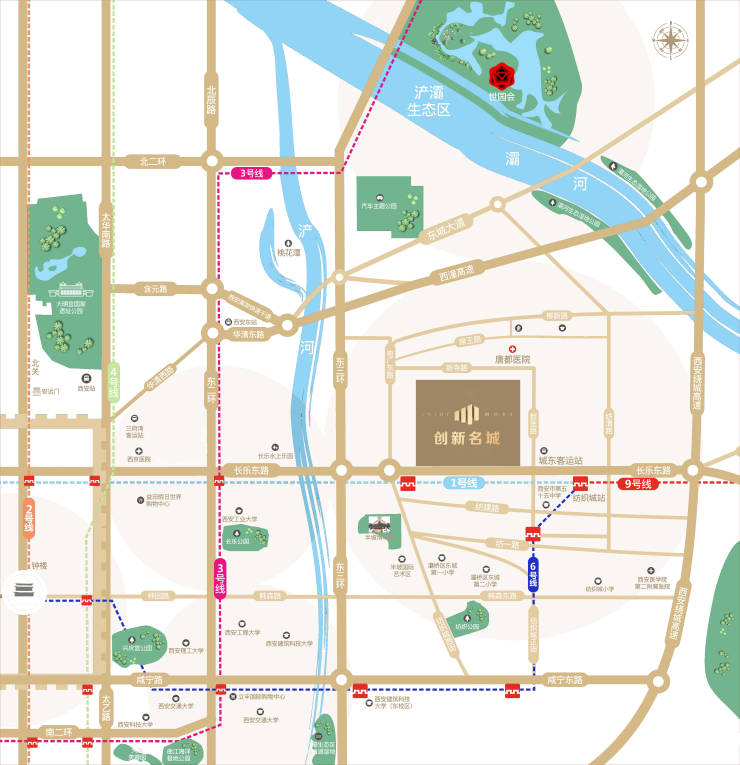 生态配套:项目拥有得天独厚的生态环境“一潭、两河、三公园”的生态配套,“一潭”即桃花潭;“两河”即浐河、灞河,“三公园”即半坡遗址公园、浐灞湿地公园、西安世博园,浐灞湿地公园及西安世博园驱车仅需20分钟即可到达。
