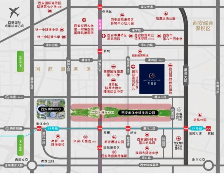 交通枢纽:直线距离约11公里可达西安北站,直线距离约30公里接驳西安咸阳国际机场,国际交通枢纽,即时驰骋世界。