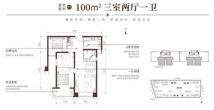 三室两厅一卫:南朝向,3室2厅1卫,建筑面积100㎡,165万/套,分布于楼栋14号楼、11号楼。