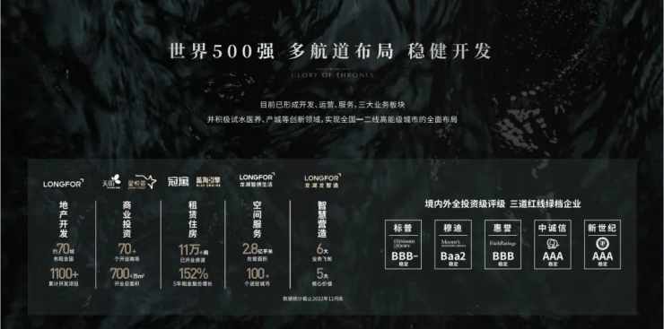 龙湖集团成立于1993年,业务遍布全国100余座城市,打造近1000个项目,是业内公认的豪宅专家、园林大师,“连续十年”全国排名前10品牌开发商,境内外全投资评级正向,连续8年三道红线持续绿档民营房企!