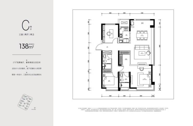 户型亮点:都市豪宅基因+创新户型+客厅270°超大面宽+充足的通风采光+功能区交流融合+主卧大套房+独立衣帽间宁静私密。