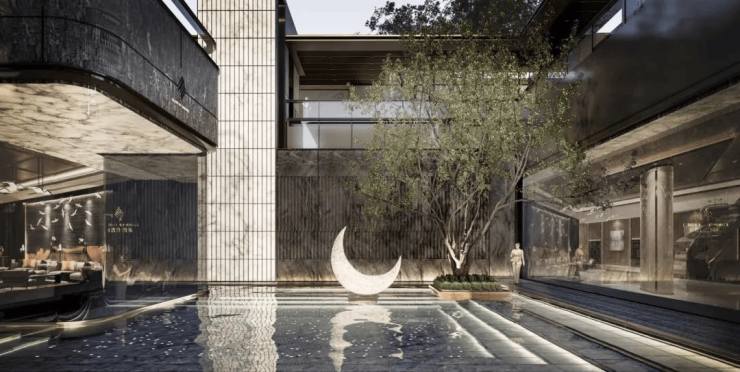 立面采用国际豪宅建筑的精奢风格,致敬顶级珠宝卡地亚的奢华美学,以“直线条和玻璃幕”构建现代美学。