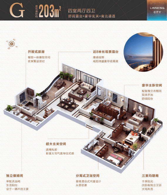 与约10800亩国家4A级景区咸阳湖为邻,坐拥稀缺的一线公园湖景,观湖跨度约1000米,一岸美景,空气湿润,鲜氧沁脾,在自然栖息中,悦享难得的氧居盛境和公园休闲时光。