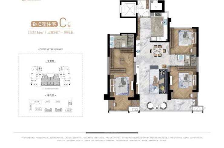 公寓产品中,A栋公寓为一栋约140米高、42F的超高层产品,其中33—42F打造的是建面约500㎡的总裁公寓,产品共计有30多套,单层层高3.9米,客厅挑空7.8米,一梯一户,一层两户,独享五星级入户大堂,2—32F则是约50—161㎡、 4T24户的平层公寓产品。B栋公寓为建面约50—129㎡、6T23户平层产品;C栋公寓为建面约80—120㎡、 4T12户平层产品。