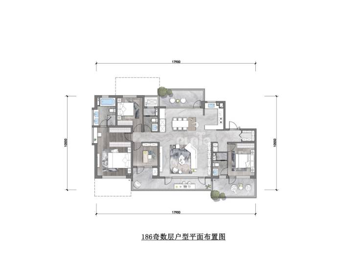 186平四房两厅三卫,17.9米大面宽,双主卧!三个明卫的户型设计,并赠送南北双露台!