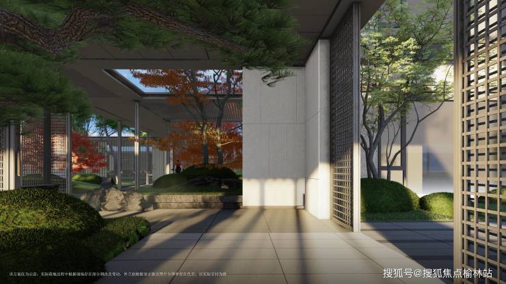 将古人大家叠院礼序再现金茂府大区;采用20%落叶,30%色彩,50%绿树,搭配形成层次分明的园林景观效果