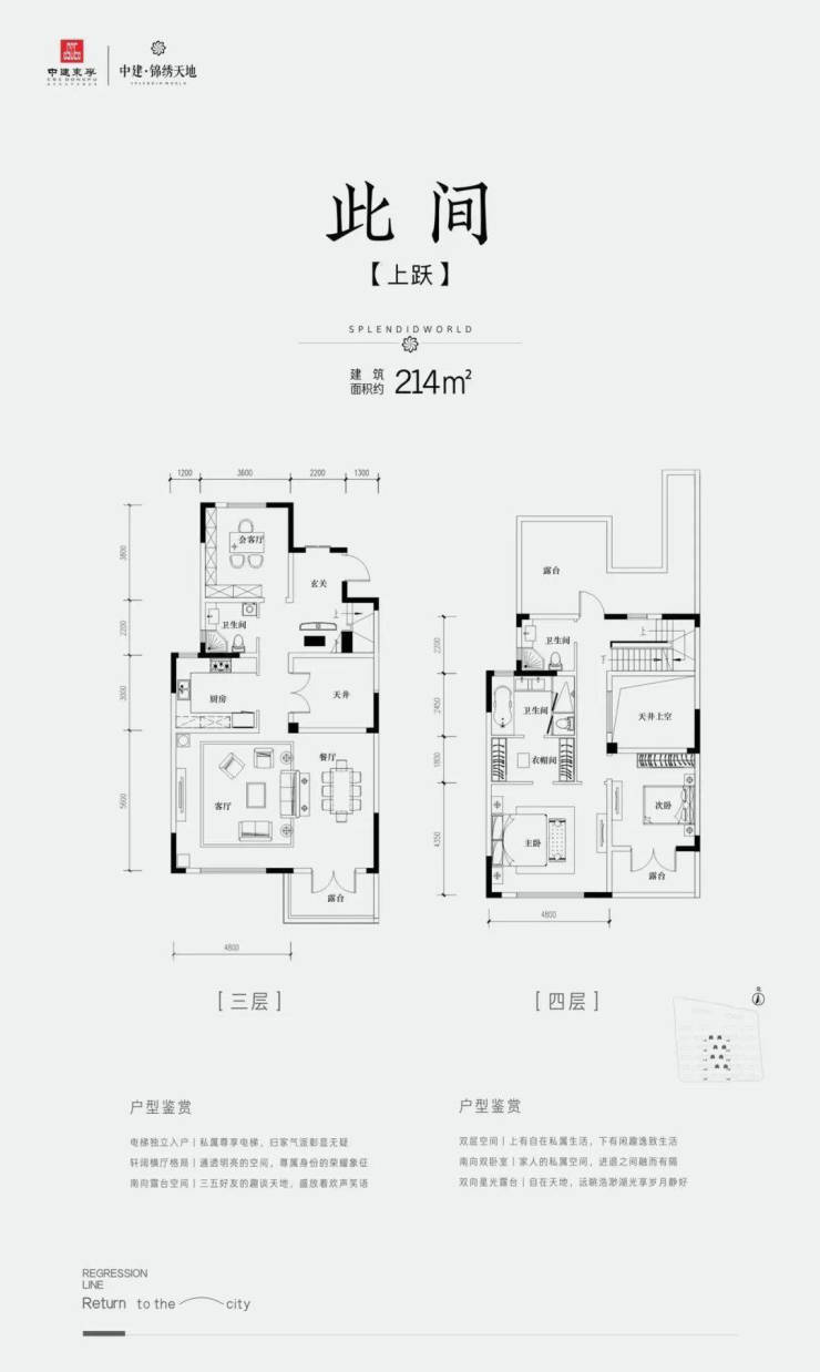 在售户型面积区间172-213㎡(上跃端户214㎡,上跃中户195㎡;下跃端户210㎡,下跃中户172㎡)均为4层的毛坯叠墅房源。