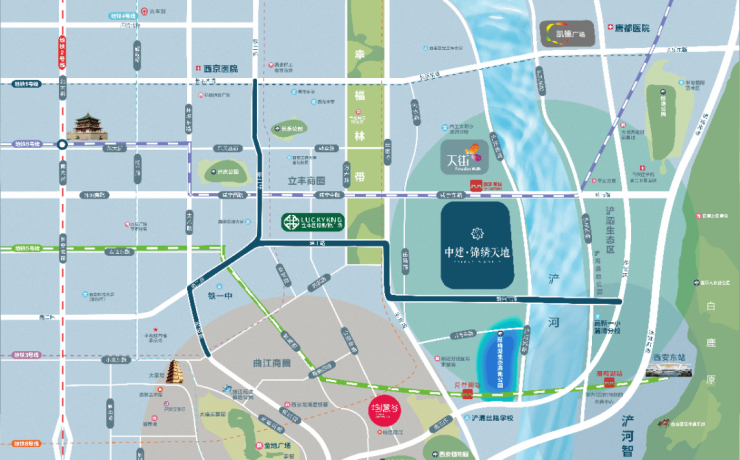 中建·锦绣天地位于浐河西路,处于浐灞生态区的南端,与曲江二期毗邻,属于主城区在三环内的稀缺区域。