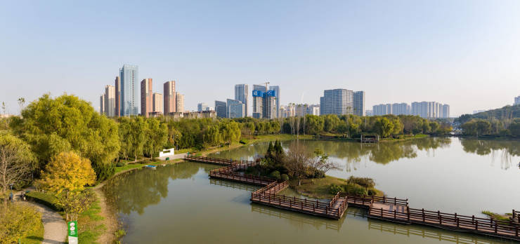 项目与桃花潭公园仅一路之隔,桃花潭公园占地面积约1516亩,其中水域面积608亩。公园地形多样,依山傍水,自然环境优美园内核心景区塑造自然岛屿,并在岛上遍植桃树,春来桃花绽放,与周边的自然环境在和谐中彰显神韵,是极具地方特色与历史沉淀的滨水景观公园。