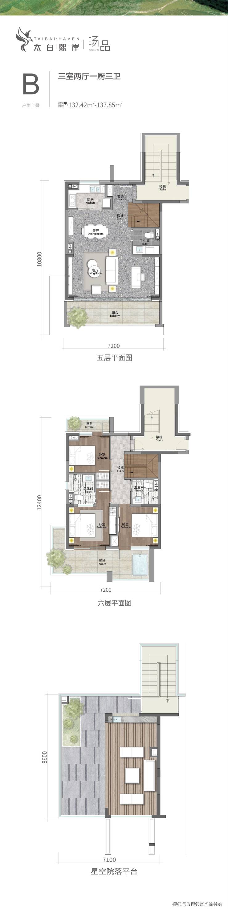 B上叠 三室两厅一厨三卫 建筑面积约:132.42~137.85㎡