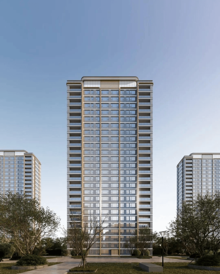 建筑设计由上海日清匠心执笔,以丰富豪宅设计经验,将曲线与直线交织、以钻感晶莹玻璃,打造现代美学建筑。建筑顶部以“玉冠穹顶”造型,呈现内敛雅致且高贵的独特审美。