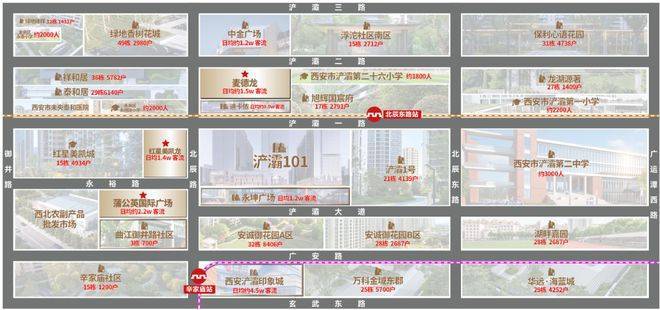 项目距地铁8号线北辰东路站约200米,3号线辛家庙站,北二环、北辰路、未央路等城市干道构筑"四横五纵"交通路网,超15条公交线路;周边林立浐灞第一小学、浐灞九小、浐灞第二中学、西大附中浐灞中学等全龄优教在侧,全维配套奠定稳定居住消费人群!