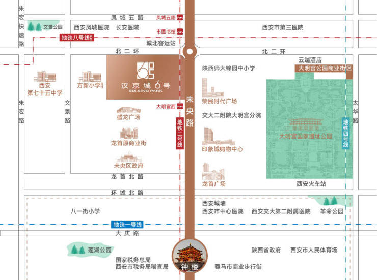 正处城市主脉未央路与北二环交汇枢纽之上,快速通达机场、高铁北客站、市政府、钟楼。