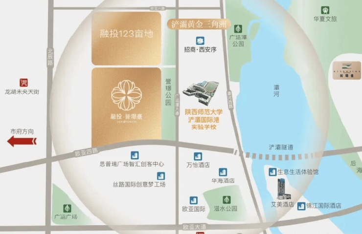 【项目地址】中国·西安·浐灞黄金三角洲,陕师大浐灞国际港实验学校西侧