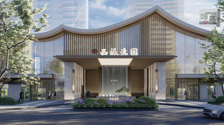 社区南大门以筑山脉之形 叠连绵之姿,诠释极致尊贵的归家仪式社区南大门建筑形态源自山川与河流。理念自中国传统叠山理水之手法,建筑形体如山脉连绵错落之态;引中国传统四水归堂之法,聚自然之灵气,借崔振宽大师之手笔,融艺术之精华。