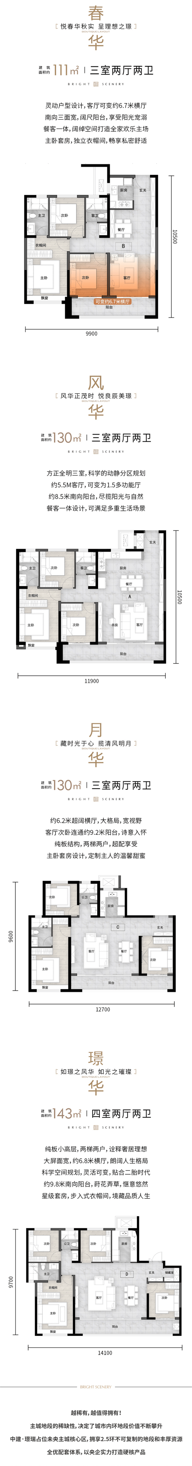 打造建面约111-143㎡纯板通透户型,方正格局,科学合理布局,超阔社交厅、别墅级大面宽,大尺寸观景阳台,硬核产品设计,营造高品质居住体验。