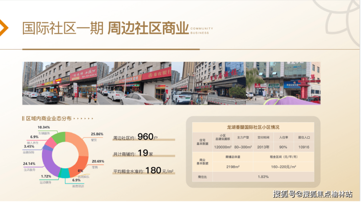 国际社区一期周边社区约960户,共计商铺19家,平均租金水平180元/㎡