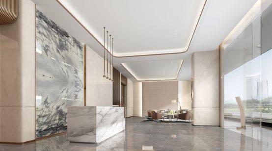 入户大堂精装交付,地面为石材,墙面为石材+木饰面