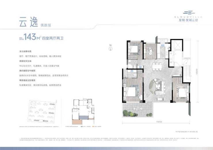 143方厅,四室两厅两卫,阳台最大赠送6.27/露台最大赠送18,得房率约98%,所在楼栋11#/12#/13#/15#号楼,梯户比2T2户,均价19919