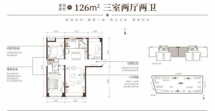 三室两厅两卫:南、北朝向,3室2厅2卫,建筑面积126㎡,208万/套,分布于楼栋14号楼、11号楼。