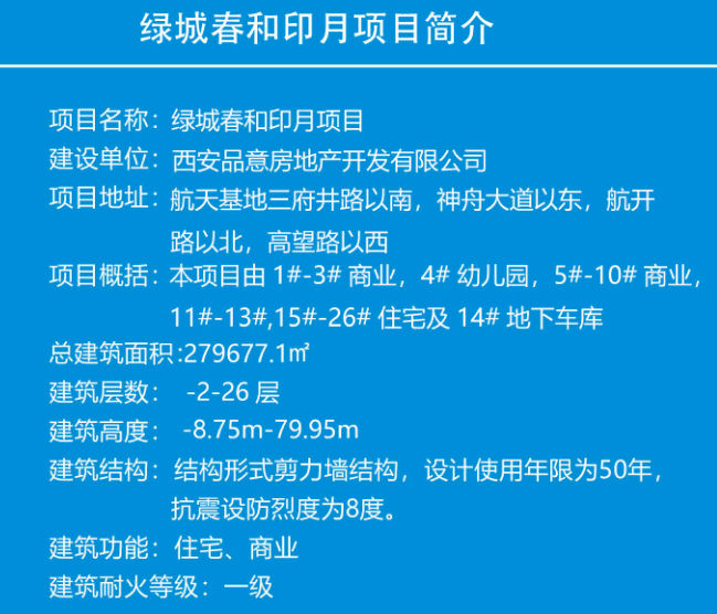 根据公示内容,项目名称为绿城春和印月,建设单位为西安品意房地产开发有限公司,总建筑面积279677.1㎡。