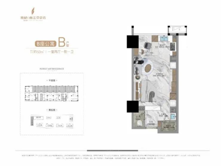 公寓产品中,A栋公寓为一栋约140米高、42F的超高层产品,其中33—42F打造的是建面约500㎡的总裁公寓,产品共计有30多套,单层层高3.9米,客厅挑空7.8米,一梯一户,一层两户,独享五星级入户大堂,2—32F则是约50—161㎡、 4T24户的平层公寓产品。B栋公寓为建面约50—129㎡、6T23户平层产品;C栋公寓为建面约80—120㎡、 4T12户平层产品。