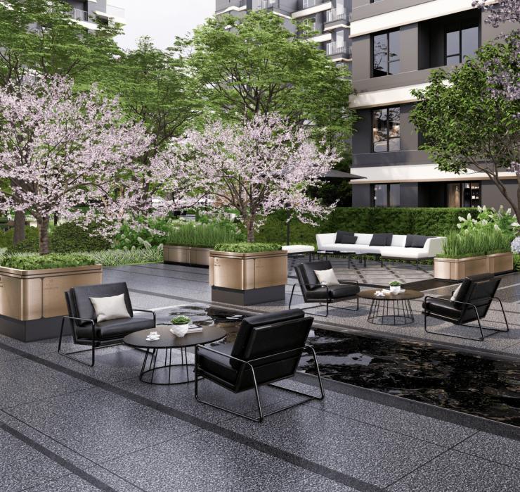 园林规划传承古长安外市内坊格局,融合热闹街区和酒店化空间,打造 “二轴四园” 布局,以“天地四季” 主题花园庭院为精华所在,归家如同微度假,四季皆有不同观感体验。