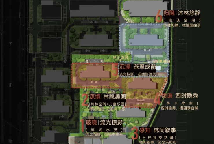 六景:林下阅读区、全龄活动区、户外学习区、林下休闲区、青年健身区、户外洽谈区