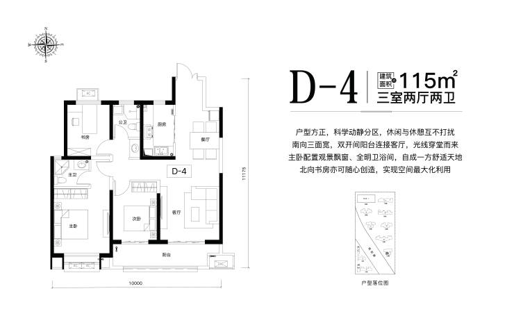 建筑面积约115—168㎡,主力户型为市场主流三房两厅两卫,全明通透,部分户型客厅双窗设计,南眺南山氤氲气象,东瞰长安中央公园,景观视野绝佳。