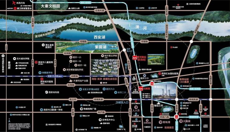 一河:项目正北1公里即是渭河生态湿地公园,驱车五分钟即可抵达,作为“八水润长安”最有名的河流,对于西安这座古城意义非凡。