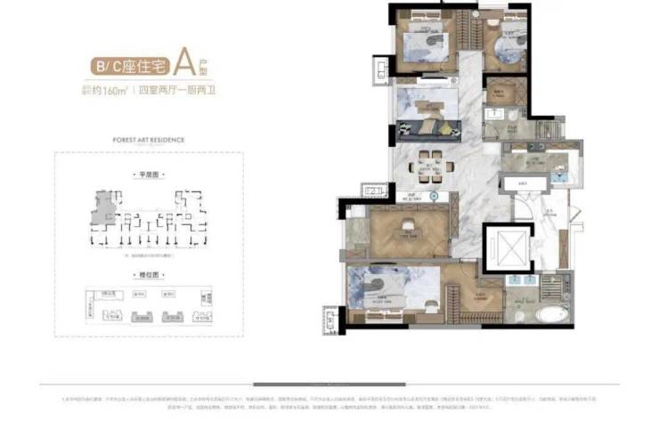 公寓产品中,A栋公寓为一栋约140米高、42F的超高层产品,其中33—42F打造的是建面约500㎡的总裁公寓,产品共计有30多套,单层层高3.9米,客厅挑空7.8米,一梯一户,一层两户,独享五星级入户大堂,2—32F则是约50—161㎡、 4T24户的平层公寓产品。B栋公寓为建面约50—129㎡、6T23户平层产品;C栋公寓为建面约80—120㎡、 4T12户平层产品。