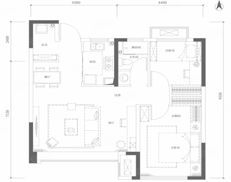 A户型:2室2厅1卫1厨, 建面88.00㎡: