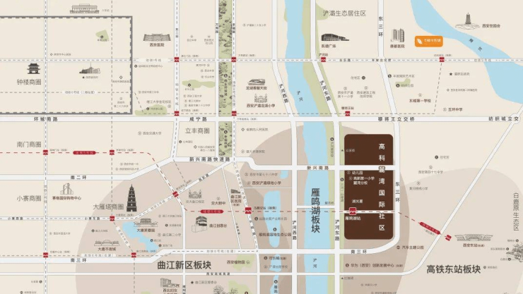 项目隶属于曲江二期与浐灞生态区以及高铁东站区域的核心位置,占据曲江、浐灞双域资源配套及大西安特大的交通枢纽中心,坐拥浐河智谷、丝路会展产业孵化园等,未来依托产业、人才聚集效应,势必将促使板块成为创新活力主场、城市价值高地。项目紧邻地铁5号线(雁鸣湖站)、地铁6/8号线(在建中),与高铁西安东站(在建中)仅一站地铁的距离;紧邻东三环,南三环、咸宁路等多条主干道环伺。