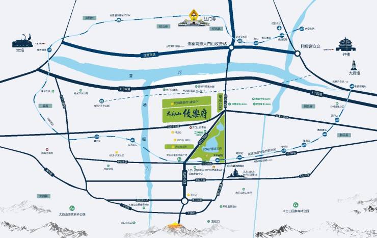 项目北侧为张子文化街区、美豪丽致/雅致酒店集群,海量游客蜂拥;东侧规划建设太白山重点市政配套;西侧生态湿地公园,漂流、垂钓、放野、户外,与自然不期而遇;南侧紧邻太白山管委会、唐镇商业街,太白山管委会与曲江新区深度合作,“商随政走”是板块发展的必然趋势,唐镇商业街已建成营业,丰富山野生活。