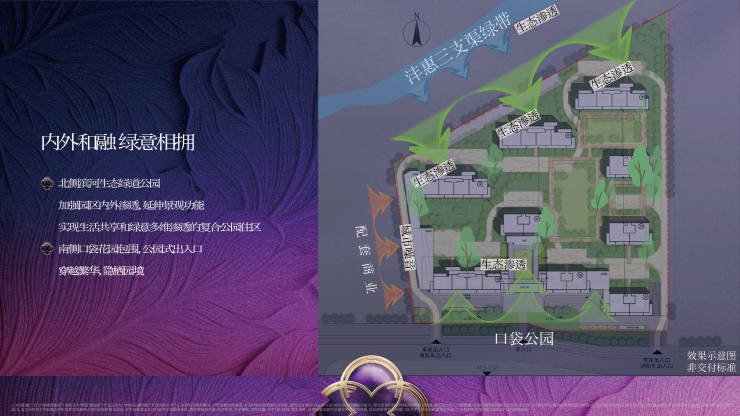 生态绿意围合之外,绿城也深知园林的重要意义,在景观设计中加强园区内外渗透,北侧延伸沣惠绿道景观功能,南侧口袋花园包围,公园式出入口,都市自然,隐奢雅居,实现生活共享和绿意多维渗透的复合公园住区。