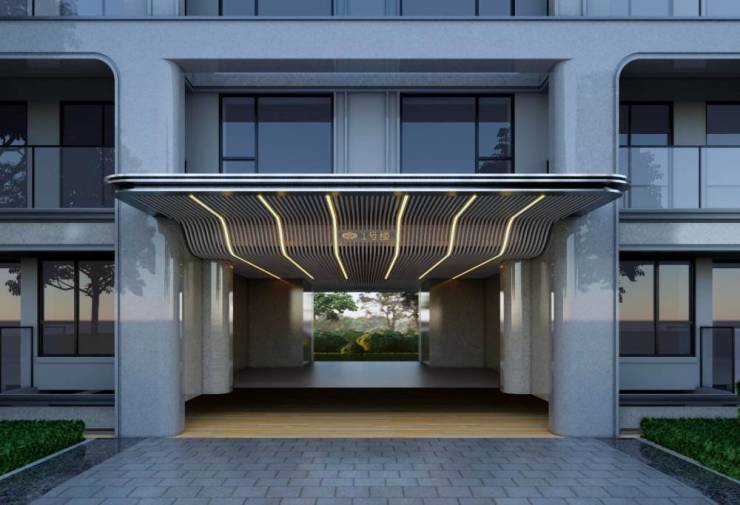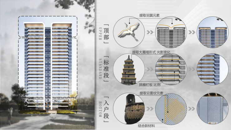 建筑立面:现代主义风格建筑,以仙鹤羽翼的姿态,焕然所在的气质