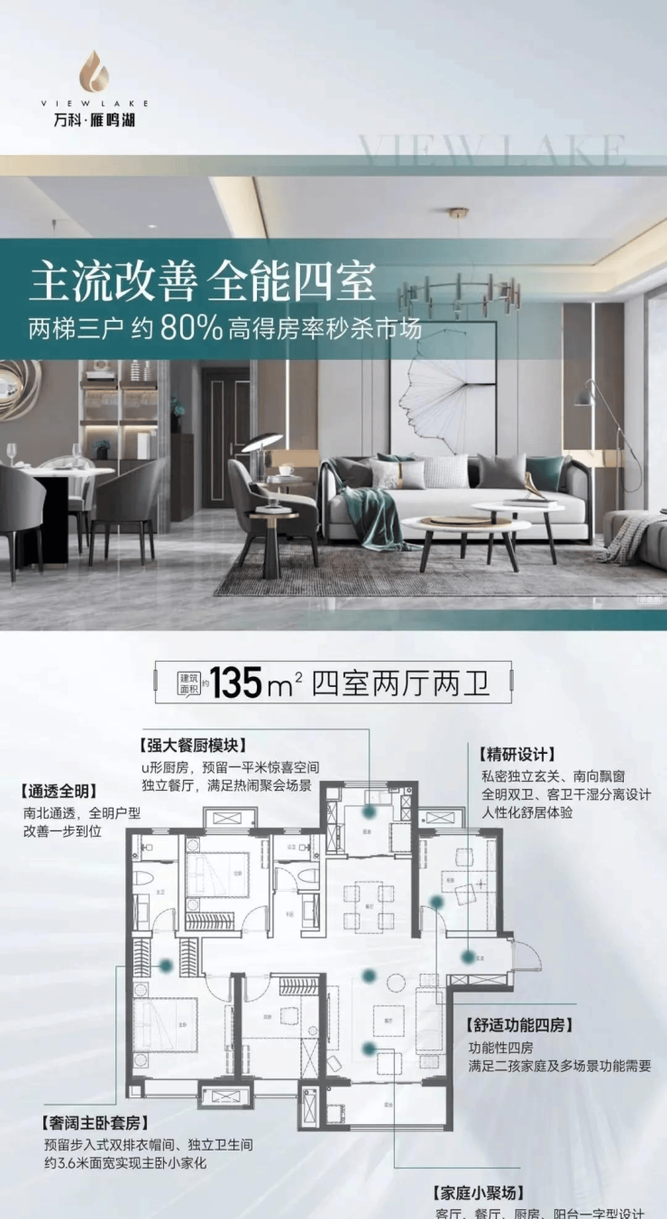 高端人居板块布局。城市级配套落位兑现及生态环境加持,推升全新的城市高端宜居板块。以唐苑为中心,融创曲江印、玫瑰园、流光云谷、云松间,即将入市的星河湾等,西安近半的豪宅环绕排布。未来在这个兼具城市配套、珍稀环境、历史底蕴的大面积高端改善产品片区,万科雁鸣湖约110-135㎡产品,成为中等面积品质改善需求客户首选。